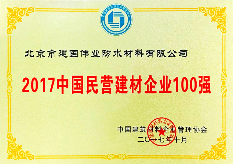 中國(guó)建筑材料企業(yè)管理協(xié)會(huì)于2017年10月26日在北京召開(kāi)了2017年度中國(guó)建材企業(yè)500強(qiáng)、建筑服務(wù)業(yè)100強(qiáng)、民營(yíng)建材企業(yè)100強(qiáng)和最具成長(zhǎng)性建材企業(yè)100和園區(qū)20強(qiáng)暨防水技術(shù)交流會(huì),來(lái)自全國(guó)各地的近千余名會(huì)員代表出席了會(huì)議。會(huì)議上,建國(guó)偉業(yè)榮獲“2017中國(guó)民營(yíng)建材企業(yè)100強(qiáng)”稱號(hào)。